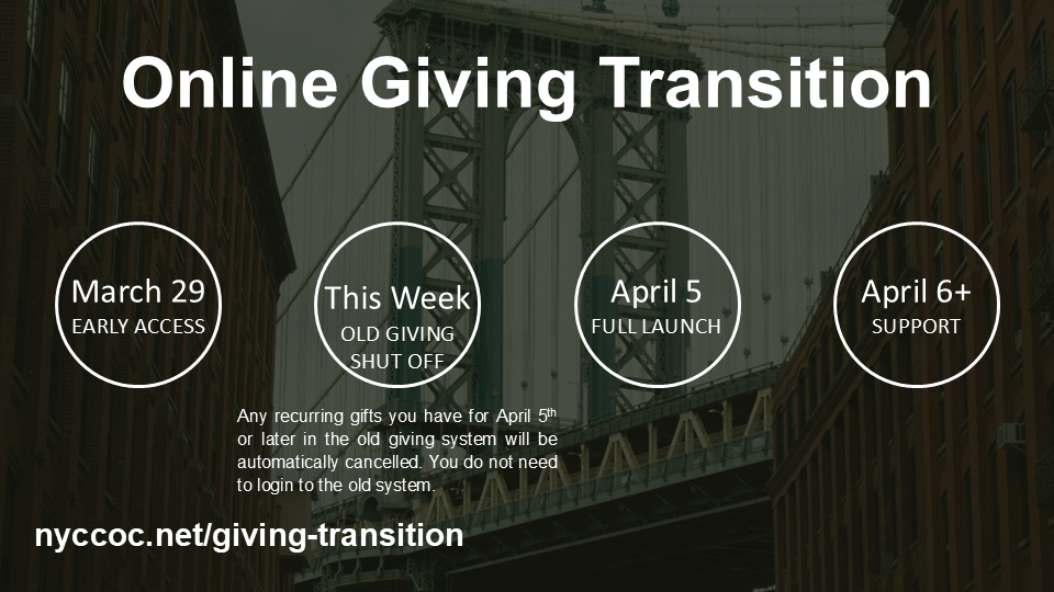 • This week, if you have ANY recurring gifts scheduled for April 5th or later, they will be cancelled in the prior giving system. Please note, if you have something scheduled for the 1st-4th, it will still run and may settle after the 5th.