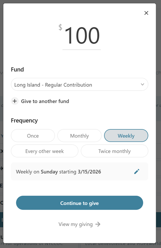 Step 2: Set Your Amount and Frequency Enter your gift amount and choose how often you’d like to give: once, weekly, monthly, or other options. Your selected fund will already be filled in. You can also add gifts to additional funds in the same transaction.
