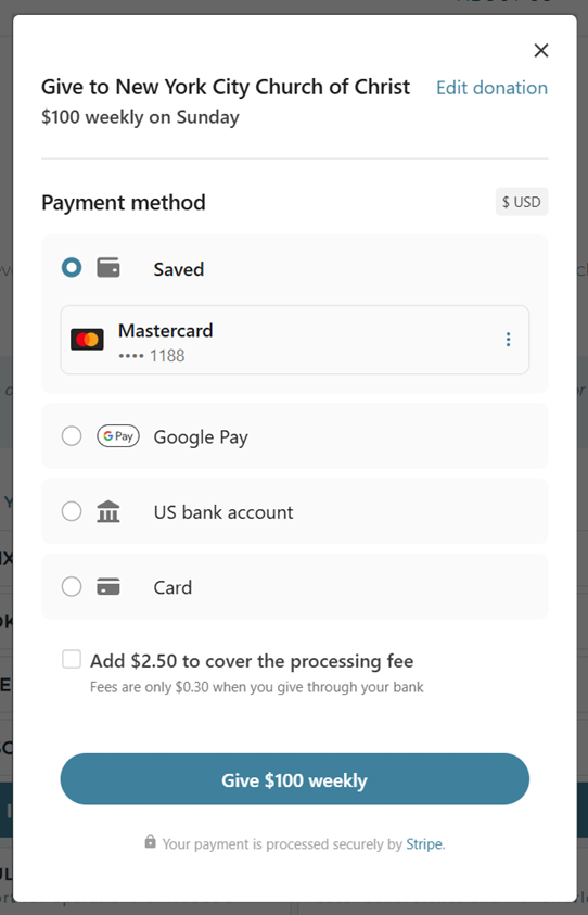 Step 4: Confirm Your Payment Method Choose how you’d like to pay: credit/debit card, bank account (ACH), Google Pay, or Apple Pay. Your payment methods are saved for future gifts, so returning donors can give in just a few taps. Fees are lowest when giving through your bank account.