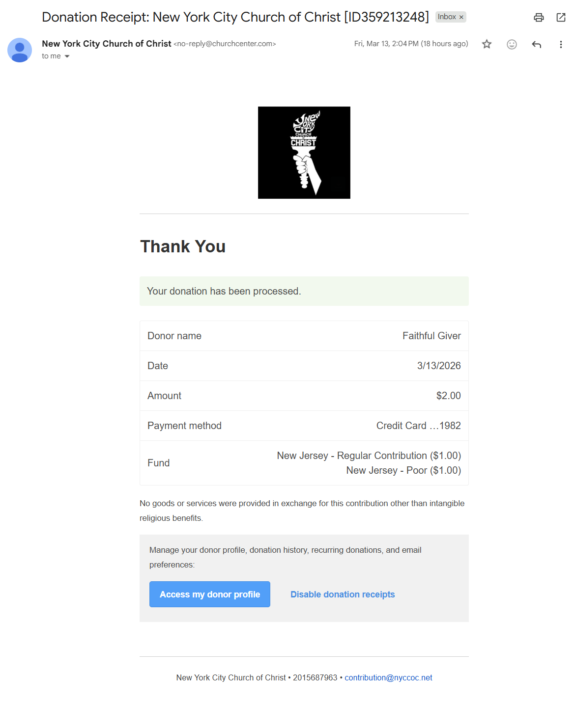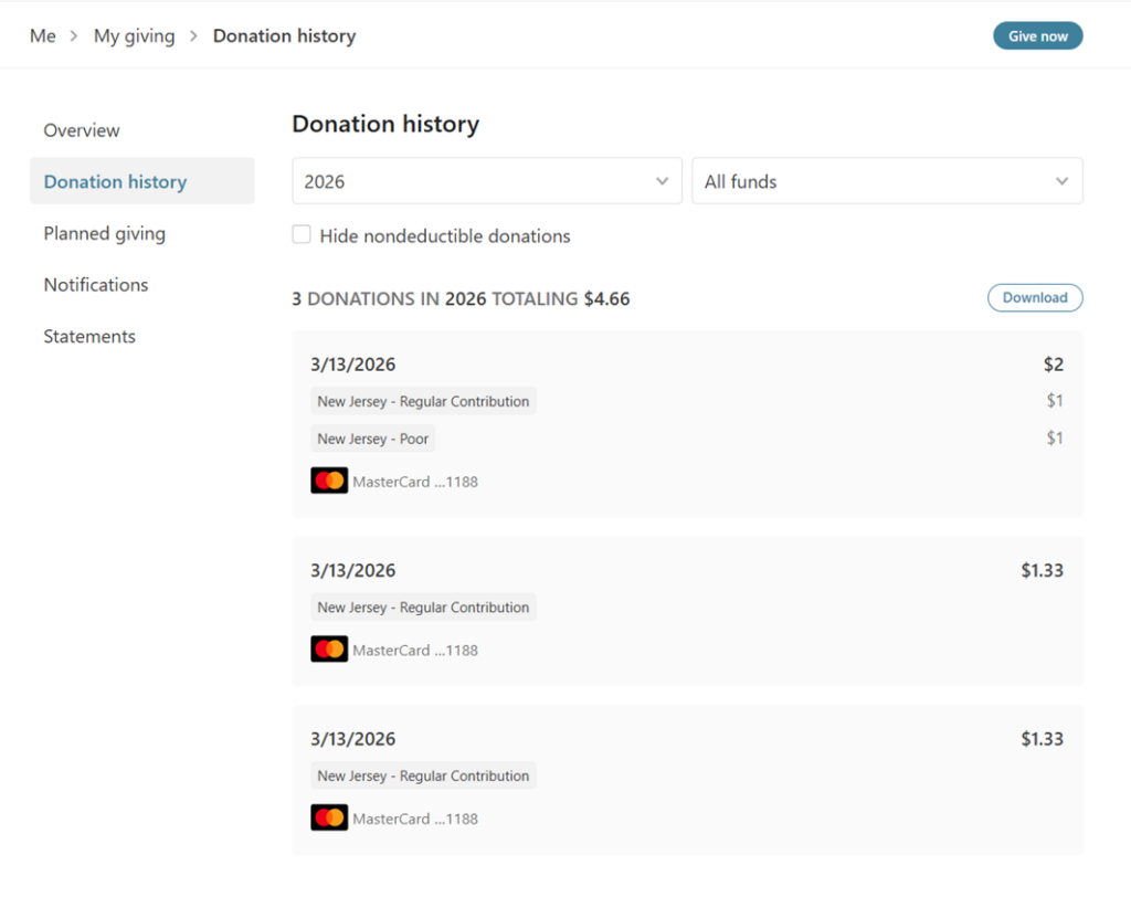 Step 6: View Your Donation History You can view your complete giving history anytime at nyccoc.churchcenter.com. Filter by year or fund, and download your records whenever you need them.