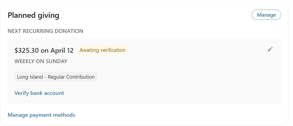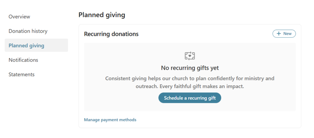Step 7: Manage Recurring Gifts If you set up a recurring gift, you can view and manage it under “Planned Giving” in your profile. From there you can update the amount, change the frequency, update your payment method, or cancel at any time.