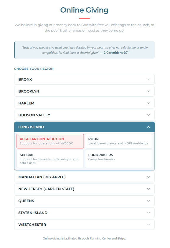 Step 1: Choose Your Region and Fund Visit nyccoc.net/donate and select your region from the list. When your region expands, choose the fund you’d like to give to. The Planning Center donation form will open right on the page.