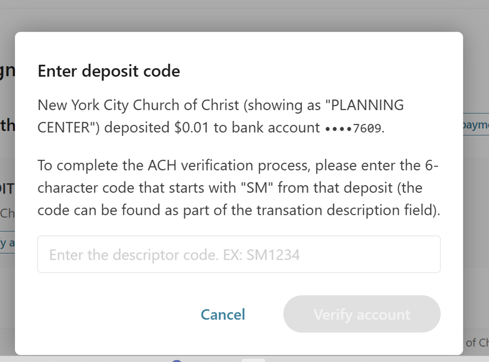 That is correct. While many major banks can be automatically verified, you may need to manually verify your banking details via SM Code micro transaction. The process works by processing a tiny transaction so you can prove ownership of your account. To complete verification, please open Planning Center, then follow these steps to add in the SM Code once you see the $0.01 transaction in your account.