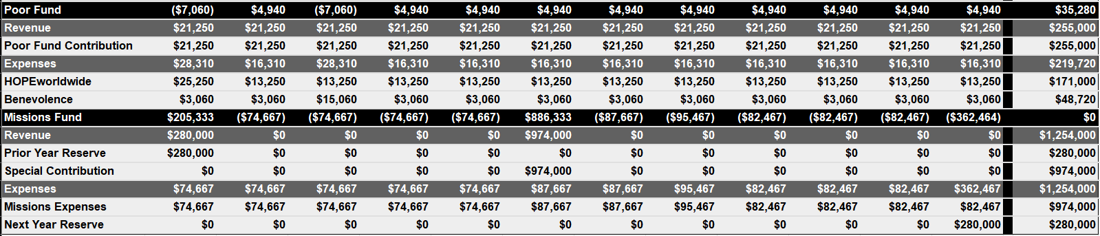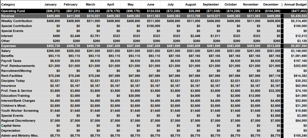 While our goal is a balanced budget, where expenses do not exceed revenue, we believe that we cannot accomplish our goals in some years without possibly spending more that we give. How can we do this? We do have some cash reserve to cover our deficit. Obviously we cannot operate indefinitely with our spending being more than our contributions. We do try to keep a cash reserve sufficient to cover about three months expenses should we face some catastrophe. It is also our prayer that our weekly giving exceeds our expectations, wiping out the projected deficit.